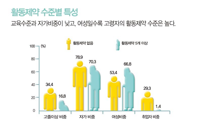 지난 1일 통계청의 ‘KOSTAT 통계플러스’ 가을호에 실린 ‘고령자의 활동제약과 건강수명’ 이슈 분석 보고서에 따르면 65세 이상 고령자의 활동제약과 건강수명을 살펴본 결과, 교육수준과 주택 자가비중이 낮고 여성일수록 사회활동에 제약이 더 크게 따르는 것으로 나타났다.