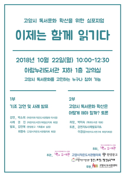 ‘이제는 함께 읽기다’라는 주제로 열리는 이번 심포지엄에서 참가자들은 고양시 독서문화 생태계의 실핏줄이 되고 있는 작은도서관, 서점, 시민단체들이 참가해 책 읽는 문화를 만들기 위한 방안을 모색하게 된다