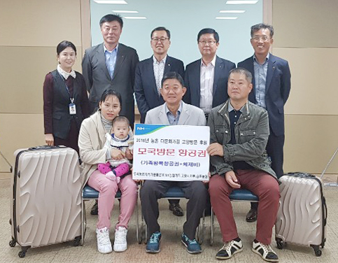 NH농협은행과 우리농업지키기운동본부, 송포농협은 베트남에 가족을 둔 농촌 다문화가정 가족을 선정해 가족동반 왕복항공권과 체재비를 지원키로 했다. 송포농협은 지난 17일 본점 회의실에서 강철희 농협중앙회 고양시지부장 이재영 송포농협 조합장 등이 참석한 가운데 왕복항공권과 여행용가방, 체재비를 지원하는 전달식을 가졌다. 이날 지원 혜택을 받은 정지명 씨 가족은 오는 11월 5일부터 12박 13일 일정으로 부인의 모국인 베트남을 방문할 예정이다.