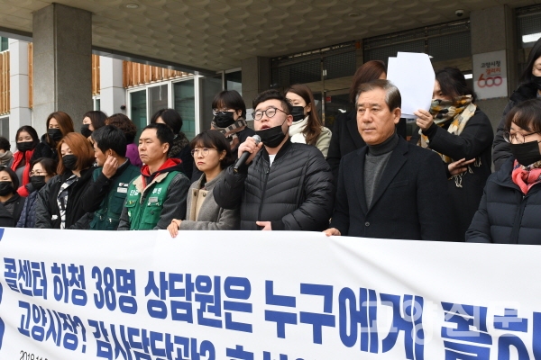 21일 민주노총 민주연합노조와 정의당 고양 노동위원회, 민원콜센터 상담원 30여명 등은 시청 앞에서 기자회견을 열고 “콜센터 비정규직들이 시와 용역업체가 체결한 계약서에 못 미치는 기본급을 받으면서 각종 업무평가와 경쟁시스템으로 인한 업무스트레스에 시달리고 있다”며 처우개선을 촉구했다.