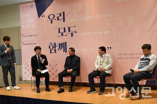 2부 순서인 도시재생 토크콘서트 순서에는 이재준 고양시장을 비롯해 윤전우 서울시 도시재생센터 사무국장, 안정희 한국도시재생활동가네트워크 대표, 정광섭 고양시도시재생센터장이 무대 위로 올라 도시재생에 대한 참석자들의 궁금증에 대해 대답하는 자리가 마련됐다.