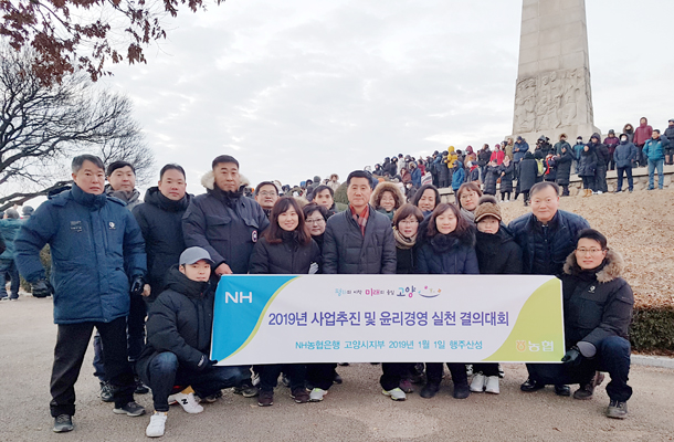NH농협은행 고양시지부(지부장 김재득)가 2019년 기해년 새해 첫날인 1일(화) 덕양구 행주산성에 올라 종합업적 상위권 도약을 위한 ‘사업추진 실천 결의대회’를 가졌다. 또한 정직과 신뢰를 바탕으로 바르고 투명한 정도경영을 통해 농업·농촌의 발전과 금융산업 발전에 이바지하고, 사회적 책임을 다하는 윤리적 기업이 되기 위한 ‘윤리경영 실천 결의대회’도 병행했다.