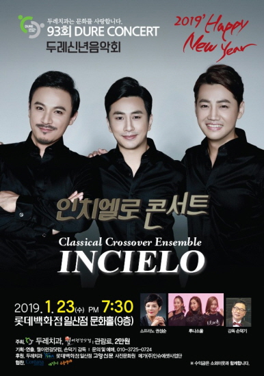 [고양신문] 한 달에 한 번, 수준 높은 출연진을 초청해 고양시민들에게 기쁨과 나눔의 무대를 선물해 온 두레콘서트가 2019년 첫 무대를 남성파페라그룹 ‘인치엘로’의 힘찬 목소리로 시작한다. 2008년 창단한 인치엘로는 2명의 테너와 한 명의 바리톤으로 구성된 대한민국을 대표하는 1세대 팝페라 그룹이다. ‘클래식크로스오버 앙상블의 선구자’로 불리는 이들은 어느 무대에서든 완벽한 하모니를 자랑한다.