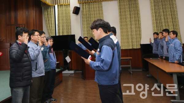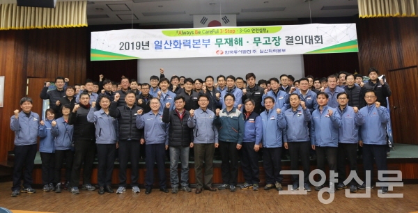 [고양신문] 고양시 백석동에 자리한 한국동서발전 일산화력본부(본부장 이경로)가 지난 17일 전 직원과 협력사가 함께 참석한 가운데 ‘2019년 무재해 전호기 4년 연속 무고장’ 구현을 위한 결의대회를 개최했다. 이날 행사는 무고장 경과보고와 안전결의문 낭독에 이어, 파트별로 무재해 안전을 소망하는 사진을 부착하는 순서로 이어졌다.