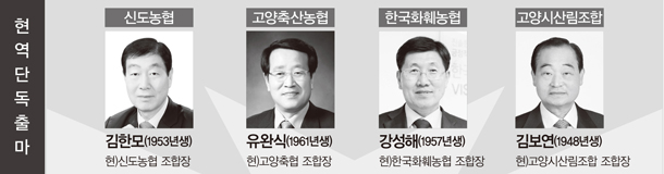 도전자가 보이지 않아 현역의 무난한 재선이 예측되는 조합은 신도농협(조합장 김한모), 고양축산농협(조합장 유완식), 고양시산림조합(조합장 김보연), 한국화 훼농협(조합장 강성해) 4곳. 김한모 조합 장과 김보연 조합장은 초선 임기를 원만 하게 치러 조합원들로부터 다시 한 번 임기를 부여받는 기쁨을 안을 것으로 보인다. 조합원 자격시비가 불거져 지난해 재선거를 치른 고양축산농협은 다시 치러진 선거에서도 유완식 조합장이 거뜬히 승리를 거두며 일찌감치 경쟁자를 따돌렸다. 이미 3번의 임기를 역임한 강성해 조합장 역시 한국화훼농협의 성장을 이끌며 4선을 예약했다.