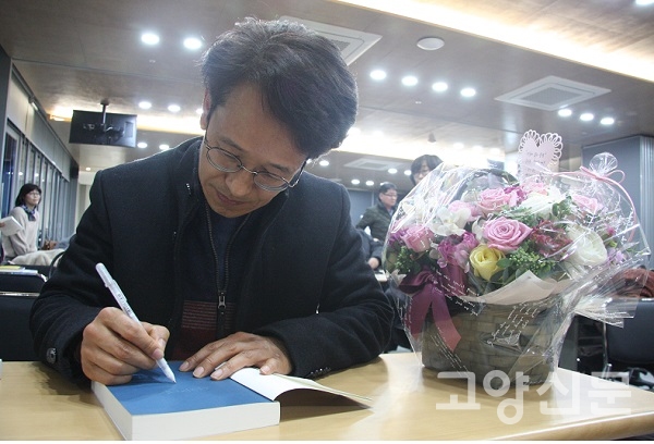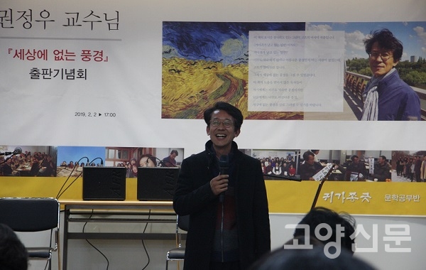 [고양신문] 평론가이자 『허공에 지은 집』이라는 시집을 출간한 시인이기도 한 충북대 권정우 교수가 산문집 『세상에 없는 풍경』을 냈다. 지난 2일 일산의 인문학 모임 귀가쫑긋에서 권 교수의 출간 기념식이 열렸다. 그는 대학에서 뿐만 아니라, 귀가쫑긋 문학공부반에서 8년째 수업을 진행하고 있으며, 작년부터 ‘시인이 읽어주는 도덕경 수업’도 하고 있다. 이날은 문학반에서 그의 수업을 듣고 있는 회원들과 큰 누나 등 지인들이 참석해 분위기를 띄웠다. 큰 누나는 그의 산문 속에 자주 등장하는 인물이어서 반가움을 더했다.