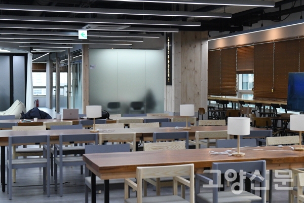 입구를 들어서면 탁 트인 공간구조가 방문자들을 반긴다. 지난 23일 일산동구 장항동 SK엠시티 6층에 문을 연 고양경기문화창조허브의 모습이다. 비즈니스 미팅 뿐만 아니라 개인업무, 네트워킹 등 스마트오피스를 자유롭게 이용할 수 있는 50석의 코워킹스페이스. 안쪽에는 24명의 인원을 수용할 수 있는 강연장과 회의실(6인실 2개, 8인실 1개)이 마련되어 있다.