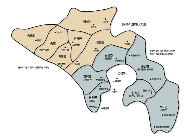 하지만 이 책은 1916년 일제에 의해 구획된 지방행정구역상의 고양군 지역 전체를 고양의 역사로 다루고 있다. 당시 일제는 지금은 서울의 경계 안에 있는 6개 면을 고양군에 붙여, 고양군이 총 12개 면을 관할하는 기형적인 행정구역을 만들었다. 구체적으로 살펴보면, 지금의 고양땅 외에 은평면(은평구), 연희면(서대문구), 용강면(마포구와 여의도), 숭인면(동대문·강북구), 한지면(성동·용산구), 뚝도면(광진구)이 모두 고양군에 속했다. 사대문 안과 일본군 군영이 주둔했던 용산 일부를 제외하면 수도 경성의 외곽을 고양군이 모두 둘러싸고 있는 형국이었던 것이다. 이는 당연히 오백년을 이어온 조선의 수도 한양의 위상을 축소하려는 일제의 의도에 의한 것이었다.