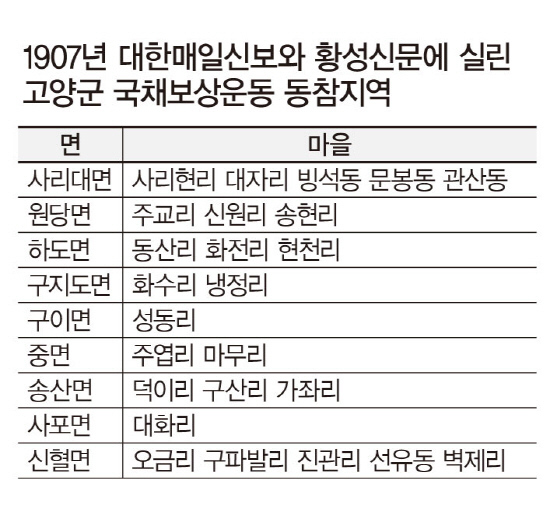 대구에서 시작된 운동은 전국으로 퍼졌는데, 놀랍게도 고양땅에서도 수많은 사람들이 이 운동에 동참했다. 대한매일신보와 황성신문에서는 국채보상운동 성금 기탁자 명단을 지속적으로 게재했는데 사포면, 송산면, 구이면, 사리대면, 원당면, 구지도면, 신혈면, 하도면, 중면 등 고양시 9개 면 전 지역에서 명단이 발견된다. 구체적 마을이름을 살펴봐도 대화리, 대자리, 덕이리, 구산리, 가좌리, 문봉리 등 지금까지도 고스란히 사용하고 있는 지명이라 위치를 쉽게 짐작할 수 있다.