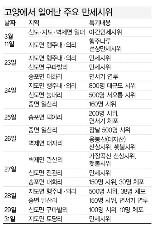 3월 11일 시작된 고양의 시위가 3월 말까지 이어졌다가, 4월에는 흔적이 보이지 않는다. 일제의 진압이 그만큼 집중적이고 잔혹했다는 뜻이다. 의병전쟁을 이야기하면서도 거론됐듯, 서울과 가까운 고양땅은 그만큼 일제의 병력 출동이 용이한 곳이었기 때문이다.