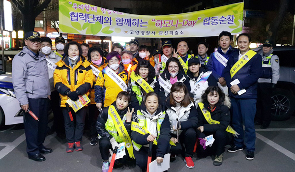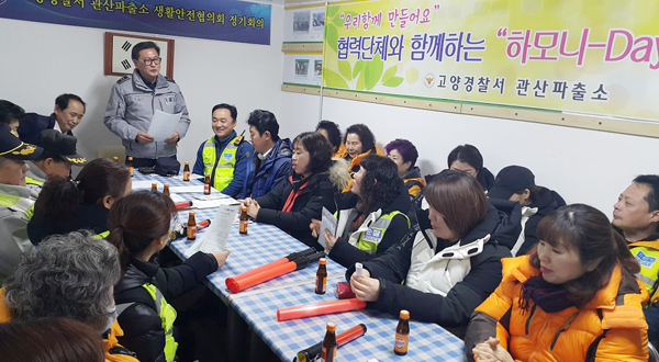 고양경찰서(서장 강신걸)는 지난달 27일 오후 8시경, 2019년 신학기를 앞두고 관산파출소 협력단체인 생활안전협의회와 자율방범대 등 민·경 합동으로 청소년선도 활동 및 안전한 지역치안 분위기 조성을 위한 '우리 함께해요' 캠페인을 가졌다. 공동체치안 활성화를 위해 관산파출소에서는 생활안전협의회와 자율방범대(관산자방대, 내유자방대, 신성어방대, 관산어방대) 등 협력방범 체제를 유지하고, 범죄취약지에 대한 주기적인 순찰로 주민들로부터 좋은 반응을 보이고 있다.