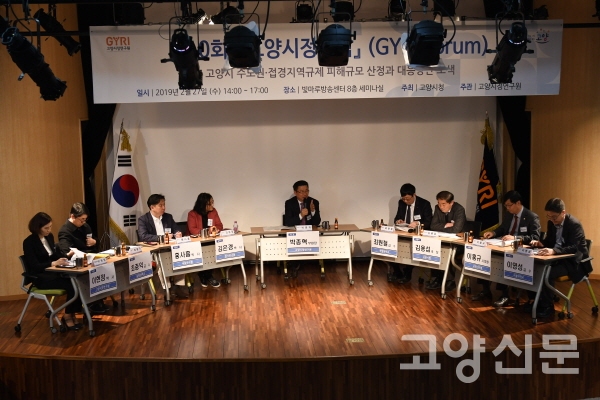 27일 고양시정연구원에서 주최한 고양시정포럼이 ‘고양시 수도권 접경지역규제 피해규모산정과 대응방안 모색’이라는 주제로 2시간 동안 열렸다. 홍사흠 국토연구원 책임연구원, 최충익 강원대교수, 김은경 경기연구원 선임연구위원이 각각 발제를 맡았으며 이홍규 시의원, 이영성 서울대 교수, 최철원 한양대 교수, 김용섭 도시균형개발국장, 이현정 고양시정연구원 선임연구위원이 토론을 진행했다.