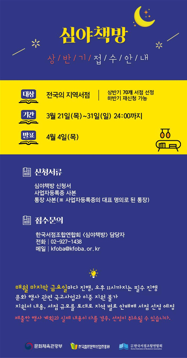 이번 ‘심야책방’ 사업은 지난해 진행된 ‘책의 해’ 심야책방과 궤를 같이 하며, 선정된 전국 서점에서 폐점 시간을 연장(오후 11시)해 서점별 특색을 살린 문화행사를 진행하는 형식으로 운영된다. 상반기에는 4~7월 마지막 주 금요일에 열린다. (4월 26일, 5월 31일, 6월 28일, 7월 26일)