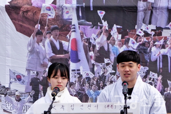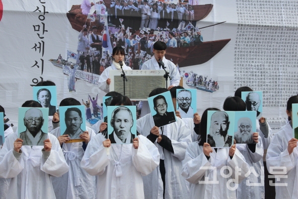 다음으로 파주 수억고등학교 ‘민족얼지킴이’ 동아리에서 활동하는 배세준군과 이아람양이 ‘쉽고 바르게 읽는 3·1독립선언서’를 낭독했고, 33명의 청소년들이 독립선언서에 이름을 올린 민족대표들의 얼굴을 받쳐 들고 한 명 한 명 이름을 호명했다. 이어 역사어린이합창단이 3·1절 노래를 합창하고, 백창환 지부장이 만세삼창을 선창하며 개회식이 마무리됐다.