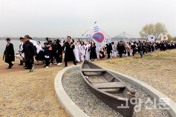 행주산성에서, 마을에서, 배 위에서…. 100년 전 행주나루터에서 울려 퍼졌던 고양땅 선조들의 외침이 생생하게 되살아났다. 사단법인 민족문제연구소(소장 임헌영) 고양파주지부(지부장 백창환)가 주최한 3·1혁명 100주년 기념 행주나루터 선상만세시위 재현행사가 지난달 30일 고양 행주산성역사공원에서 열렸다.