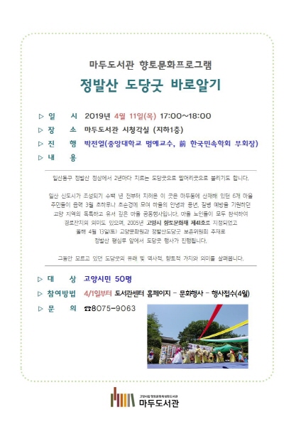 [고양신문] 고양시 마두도서관은 오는 4월 11일 고양시민을 대상으로 향토문화 특성화 프로그램 ‘정발산 도당굿 바로알기’를 진행한다.