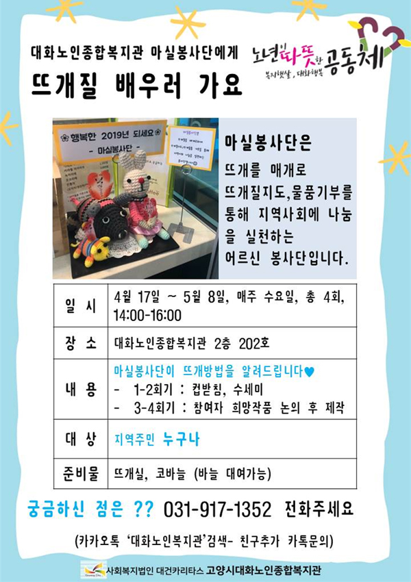 마실봉사단은 뜨개를 매개로 뜨개물품기부와 뜨개질 지도를 통해 지역사회에 나눔을 실천하는 봉사단이다. 이번 뜨개질 배움터는 지역주민 누구나 참여가능하며 4월 17일 ~ 5월 8일, 매주 수요일 오후 2~4시로 총 4회 진행된다. 1회에는 컵받침, 2회에는 수세미 뜨기를 진행하고 3~4회에는 참여자들이 만들고 싶은 작품을 미리 정하면 봉사자들이 뜨개방법을 안내할 예정이다. 준비물은 개인 실과 코바늘이며 코바늘은 복지관내에서 대여가 가능하다. 뜨개질배움터와 관련된 문의는 대화노인종합복지관( 031-917-1352 )으로 하면 된다.