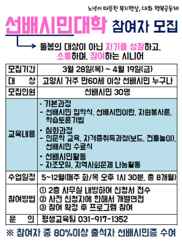 [고양신문] 대화노인종합복지관(관장 최윤정)은 선배시민대학 2기 참여자를 이달 19일까지 모집한다. 선배시민대학이란 돌봄의 대상으로 여겨졌던 노인들이 돌봄의 대상에서 벗어나 지역사회와 후배시민을 돌보는 선배시민이 되도록 양성하는 프로그램이다. 교육내용은 선배시민론, 자원봉사론, 학습토론기법뿐만 아니라 인문학 교육, 보드게임지도사, 전통놀이지도사 자격증 취득과정도 포함돼 있다.