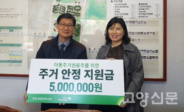 [고양신문] 초록우산어린이재단 경기북부지역본부(본부장 오은화, 사진 오른쪽)는 지난 4일 고양시 화정1동행정복지센터(동장 유영렬, 사진 왼쪽)와 함께 주거 안정 지원금 전달식을 진행했다. 이번 지원은 재단에서 진행하고 있는 주거비 지원 사업의 일환으로, 화정1동 주민 중 대상자를 추천 받아 해당 가정에 보증금 500만원을 전달했다. 대상자로 추천된 가정은 세 명의 아들과 엄마가 한 방에 생활하는 모자가정으로, 전달받은 후원금을 통해 보다 안정적인 주거 환경으로 이전할 계획이다.