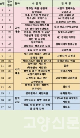 올해로 5년째 실시되고 있는 이번 지원사업에는 60개 팀이 지원해 17개 팀이 선정됐다. 선정된 팀은 행주얼마을공동체 음악축제(시민과 함께 하는 오카리나), 호수 어린이 명작극장(극단 자유마당), 청소년이 찾아가는 예술나눔음악회(한국청소년문화연대) 등이다. 이들 팀들은 문학, 시각예술, 공연예술 등에서 각 팀별로 11월까지 고양시 곳곳에서 다양한 공연을 펼치게 된다.