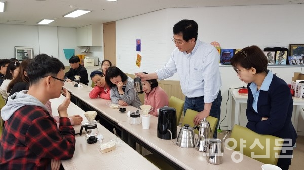 [고양신문] 풍산역 인근 에스플러스타워 1층에 자리 잡고 있는 '트리니커피 로스터리(대표 문경진)'가 16일 벽제동 '애덕의 집(원장 김경자 안나미라아)'에서 커피특강을 했다.