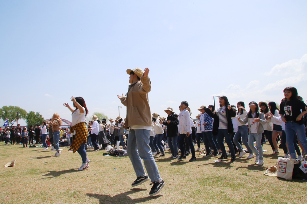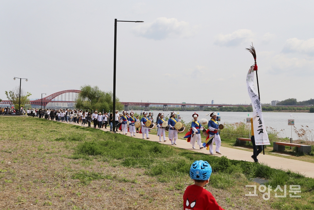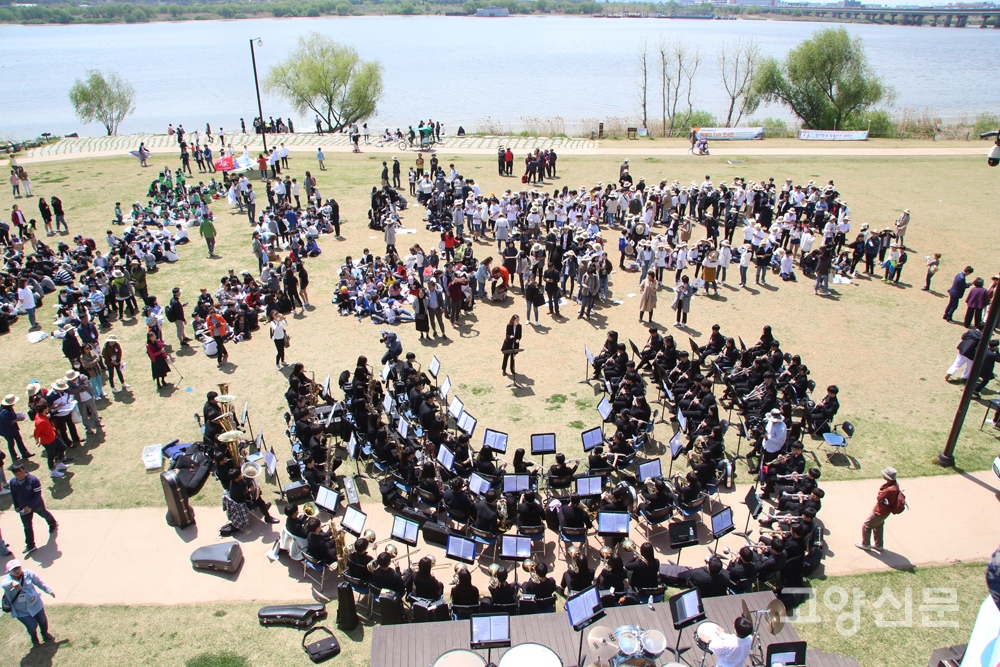 행주산성 역사공원에서는 고양파주지역 학생들이 중심이 돼 시민 1000여 명이 참여했다. 교육청의 후원으로 오전 11시쯤 버스를 대절해 행사장에 모인 학생들만 약 600명. 고양파주 초‧중학생들이 집결해 플래시몹 등 사전 행사를 진행했다. 특히 고양 신일중학교 관현악단(90명)이 야외공원을 펼쳐 큰 박수를 받았다.