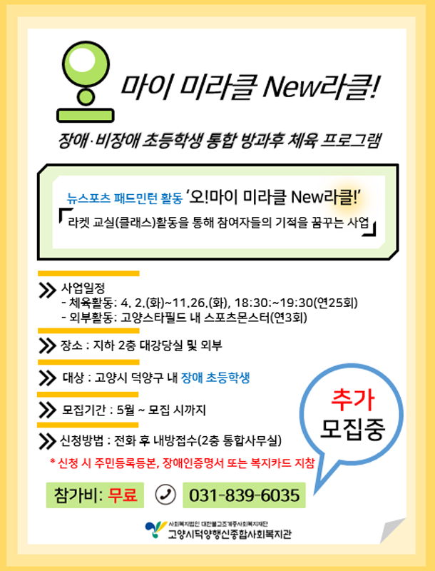 대한불교조계종 사회복지재단에서 위탁 운영하는 고양시덕양행신종합사회복지관(관장 선경석)에서는 장애·비장애 통합방과 후 체육 프로그램 참여 아동을 추가 모집하고 있다. 장애·비장애 통합방과 후 체육 프로그램 ‘오! 마이 미라클! New라클‘은 (재)데상트스포츠재단 후원, 한국사회복지관·사회복지공동모금회 지원으로 진행되는 사업이며, 장애·비장애 초등학생 전학년이 참여 할 수 있다.
