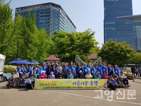 10일, 고양국제꽃박람회가 개최되고 있는 호수공원에서 휠체어 탄 어르신들이 봉사자들과 함께 여유롭게 꽃 한 송이 한 송이를 즐겼다. 고양준법지원센터(소장 최종철)와 법무부 보호관찰위원 고양보호관찰소 고양지구협의회(회장 이흥윤)는 올해도 지역 어르신을 대상으로 한 휠체어 봉사 ‘아주 특별한 아름다운 동행’을 실시했다.