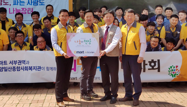 앞줄 왼쪽부터 고대원 이마트킨텍스점장, 민경환 트레이더스킨텍스점장, 양성필 고양시일산종합사회복지관장, 박준용 이마트 풍산점과 직원들, 사진에는 없지만 이시학 이마트 파주운정점장과 문평심 이마트파주점장, 김시태 이마트일산점장도 동참했다.