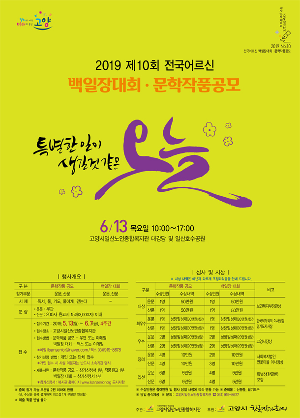 고양시일산노인종합복지관(관장 지언스님)에서는 오는 6월 13일(목), 고양시일산노인종합복지관과 호수공원 일대에서 제10회 전국 어르신 백일장 대회 및 문학작품 공모전을 개최한다. 전국 만60세 이상의 어르신을 대상으로 10회를 맞이하는 공모전에는 글쓰기에 관심이 있는 어르신들이 삶의 경험을 글로 풀어내는 장을 마련한다. 또한 자신의 기량을 마음껏 발휘할 수 있는 문화·예술 창작활동의 장을 마련하는 데 목적을 두고 있다.