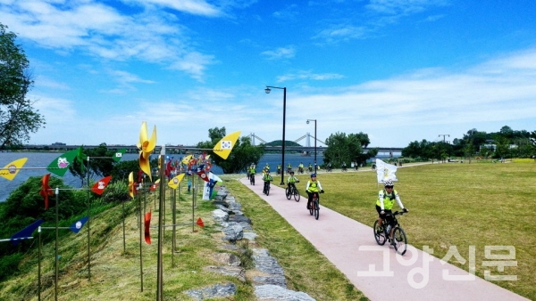 청소년 보안관 11명을 비롯해 성인회원·학부모·행사스태프 등 총 24명의 참가자들은 오전 9시 고양종합운동장을 출발해 호수공원과 신평·능곡들녘을 가로지르는 평화누리길을 따라 한강 하구 행주산성역사공원까지 갔다가 돌아오는 34㎞ 자전거 라이딩을 펼쳤다.