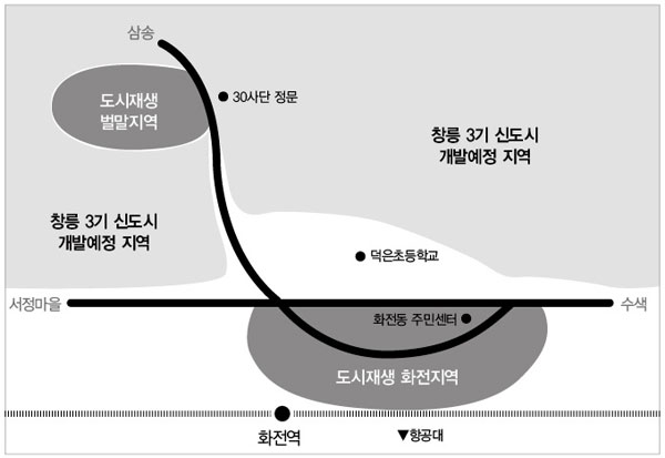 120명에 이르는 화전 도시재생주민협의체 회원 대부분이 토지나 건물을 소유한 이들임을 감안한다면, A씨의 말처럼 도시재생 뉴딜사업은 ‘개발시대의 종말’이라는 전제 하에서 설득력을 얻는 불안정한 구조였던 셈이다. 그런 상황에서 주변지역의 대규모 개발이라는 변수를 맞았으니 도시재생 사업 자체가 신뢰와 동력을 상실할 수밖에 없게 된 것이다.