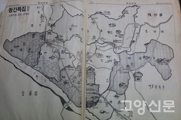 이어 특별좌담(백성운 고양군수), 심층취재(일산신도시 건설 무엇이 문제인가), 역사탐방, 지역소식, 여성과 청소년 코너 등 흥미로운 꼭지가 곳곳에 배치됐다. 8~9면에는 손으로 정성스레 그린 고양군 그림지도가 실렸고, 경제면에는 원당과 능곡, 일산지역 시장의 50여 개 농신물 소매가격을 비교한 표가 등장해 당시의 생활거점과 장바구니물가를 보여준다. 각 면을 채운 탄탄한 구성과 알찬 내용은 창간호를 내기까지 얼마나 꼼꼼한 준비가 있었는지를 짐작케 한다.