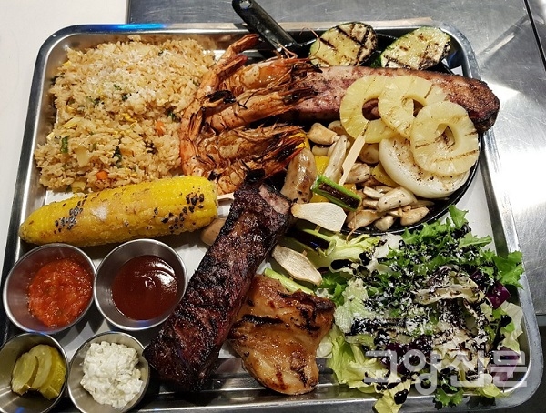 음식도 푸짐하고 맛있다. 훈제 삼겹, 샐러드, 볶음밥, 새우, 소세지, 옥수수와 각종 채소로 구성된 플래터가 이곳의 대표 메뉴다. 감자튀김과 샐러드가 함께 나오는 수제버거도 사이즈가 무척 커서 한끼 식사로 손색이 없다. 채소와 과일, 소고기 패티도 각각의 맛이 살아있다.