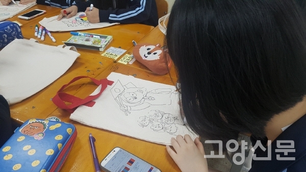 고양시자원봉사센터·다함봉사단과 연계해 진행된 이날 봉사활동에 참여한 학생들은 각자의 개성을 담은 예쁜 디자인의 에코백을 만들고, 마음을 담은 편지도 써서 다함봉사단에 전달했다. 에코백은 방글라데시 하비간즈시와 다카지역의 책가방이 없어 보자기에 책을 싸서 다니는 청소년들에게 전해질 예정이다.