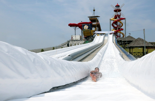 [고양신문] 본격적인 초여름 무더위가 시작된 가운데, 14일 일산 원마운트를 찾은 한 시민이 '팝핑바운스' 슬라이드를 타고 내려오며 점프하고 있다. 원마운트 워터파크는 지붕을 타고 내려오는 110m 길이 야외 워터 슬라이드 ‘팝핑바운스’ ‘바디스플래쉬’를 이달 초 신규 도입했다.