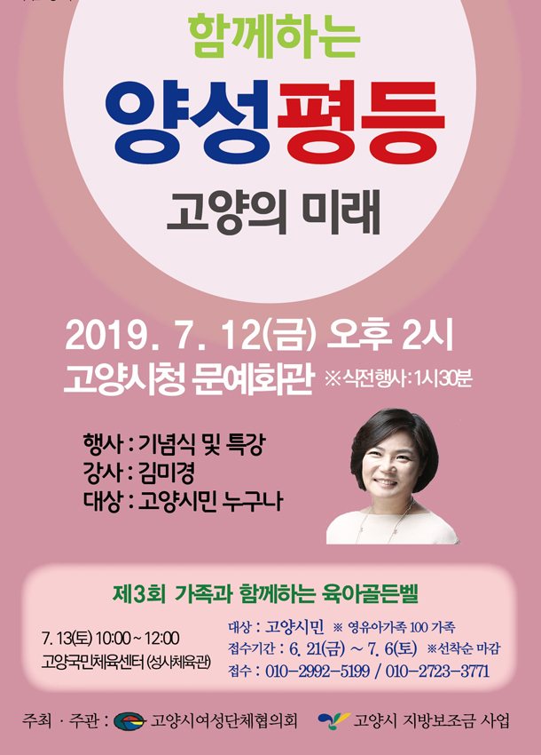 고양시여성단체협의회(회장 박미화)가 제24회 양성평등주간을 기념해 ‘함께하는 양성평등, 고양의 미래’라는 주제로 오는 12일(금) 오후 2시 고양시청 문예회관에서 김미경 강사를 초청해 특강을 연다. 이번 특강에서는 성별고정관념 탈피 하자, 양성평등한 아이로 키우는 법, 양성평등한 남자, 여자로 사는 법, 직장인을 위한 양성평등 리더십 등 5가 지의 주제로 진행된다. 특강 전에는 ‘양성평등 이제부터 시작이다’라는 주제로 초등학생 5학년과 20대 청년이 그들의 시각에서 바라보는 양성평등에 대해 이야기한다.