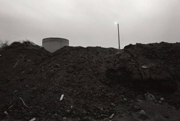 ▲ 둥근 관이 박힌 흙더미 위로 기둥 하나가 비죽 솟아있고, 그 끝에 희미한 태양빛이 걸렸다. 원형 관은 대지의 숨구멍 같기도 하고, 기둥은 하늘과 교신하는 안테나 같다. 김 작가는 “이 장면과 마주하는 순간, 직관적으로 죽음과 희망의 이미지가 동시에 떠올랐다”고 말한다.