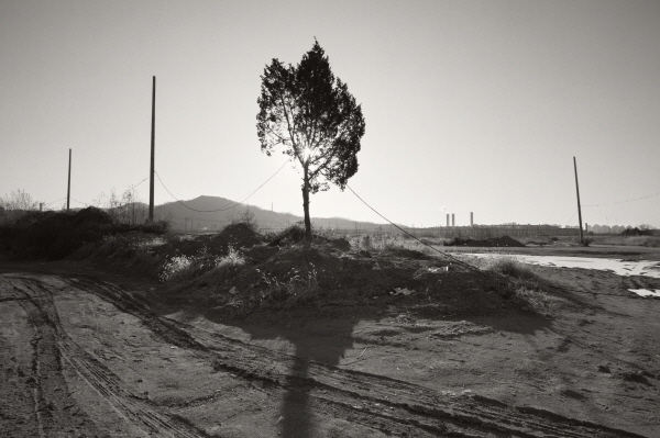 ▲ 구사일생의 운명일까. 전봇대로부터 가느다란 전선가닥 하나를 이어받은 덕분에 특별할 것 없는 나무 한 그루가 폐허 위에 덩그러니 남아버렸다. 이곳이 사람과 나무들이 함께 살았던 땅임을 외로이 증명하고 있는 듯하다. 김평기 작가는 지축을 찾을 때마다 나무의 안부를 묻듯 다양한 앵글과 각도로 이 나무를 카메라에 담았다.