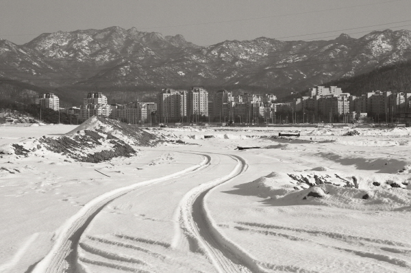 ▲ 황량한 풍경을 흰눈이 덮어줬다. 창릉천 둑방 너머로 보이는 택지개발 선배 은평뉴타운이 “그쪽은 왜 그렇게 진도가 느리냐”며 훈계를 하는 듯하다. 그런 모습을 멀찌감치 북한산이 내려다보고 있다. 김 작가는 “이 사진에서 ‘시간’을 읽어달라”고 주문했다.