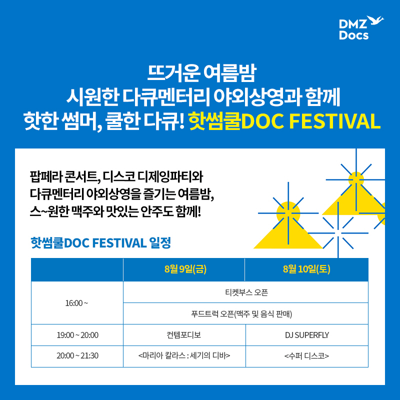 [고양신문] 일산 벨라시타 잔디광장에서 시원한 맥주와 함께 명품 다큐멘터리 영화를 즐기는 ‘핫썸쿨DOC’가 8월 9일(금)부터 10일(토)까지 이틀간 열린다. DMZ국제다큐영화제(조직위원장 이재명, 집행위원장 홍형숙)가 주최하는 여름밤의 야외상영회에는 행사 콘셉트와 어울리는 힙한 아티스트들이 출연한다.