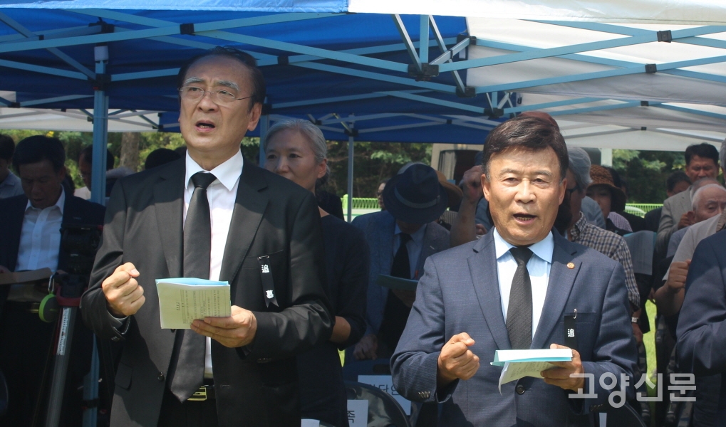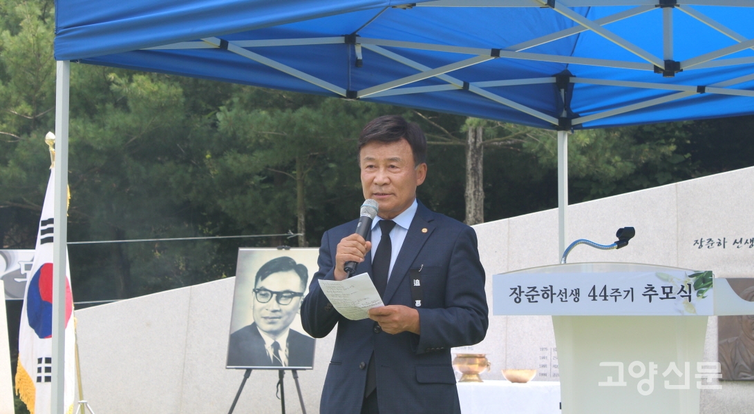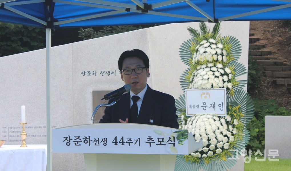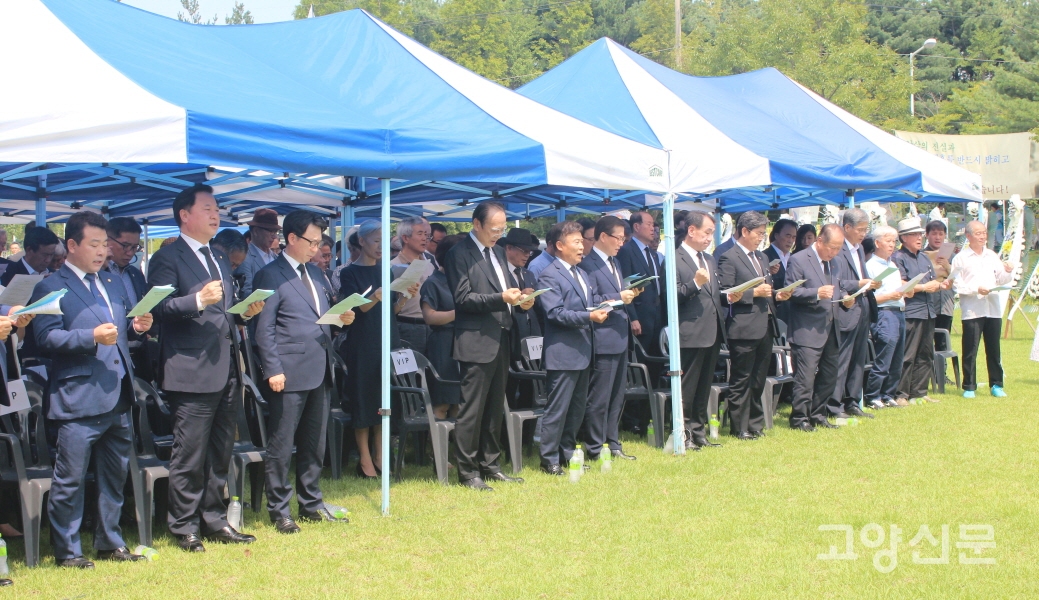 [고양신문] 청년 광복군 출신으로 박정희 군사독재를 비판하다 의문사한 고(故) 장준하 선생(1918~1975) 44주기 추모식이 고인의 기일인 17일 파주 통일동산(탄현면 성동리) '장준하공원'에서 열렸다. (사)장준하기념사업회(회장 장호권)가 주관하고 파주시와 국가보훈처의 후원으로 열린 추모식에는 고인의 유족을 비롯해 김원웅 광복회장, 최종환 파주시장, 김두관·박정 국회의원, 손배찬 파주시의회 의장, 고상만 인권운동가, 명진스님, 진성준 전 국회의원, 광복회·장준하기념사업회 회원 등 200여 명이 참석했다.