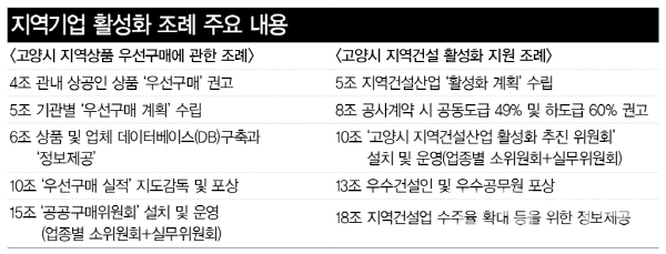지역건설산업 활성화를 위해 제안된 ‘지역건설업 활성화 조례’는 관내 중소 건설업체가 지역 대규모 개발사업이 있을 시 공동도급 및 하도급에 적극적으로 참여하는 권고규정을 핵심으로 한다. 주요 내용을 살펴보면 8조 ‘공동수급체 등 참여권장’에서 고양시를 당사자로 하는 공사계약일 경우 지역업체 비율이 공동도급 49%, 하도급 60% 이상이 되도록 권장할 수 있도록 했으며 9조 ‘지역건설근로자 우선고용과 고용안정’을 통해 지역제한 입찰공사에 참여한 업체는 인부 절반 이상을 고양시민 건설근로자로 우선 고용하도록 권고했다.