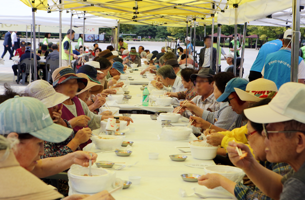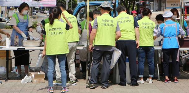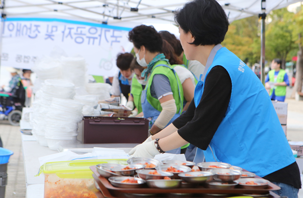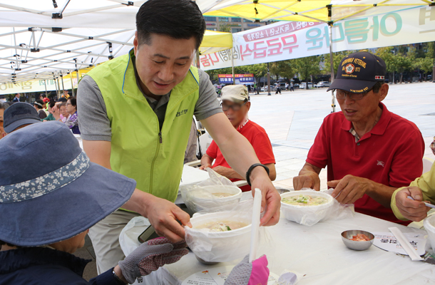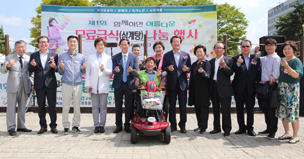 첫 번째 ‘함께하면 아름다운 무료급식 나눔 행사’가 지난 31일 오전 9시부터 일산문화공원에서 열렸다. 사)장애인권익지원협회 고양시지부(함께하면 아름다운 세상 무료급식센터 이하 ‘무료급식센터’)가 주최한 이번 나눔에는 윤창준 장애인권익지원협회 고양시지부 지회장과 이재준 고양시장, 이윤승 고양시의회 의장, 유완식 고양축협 조합장, 김재득 농협 고양시지부장과 농축협 임직원들이 참석했다. 이른 아침부터 무료급식센터와 학생 자원봉사자가 나와 삼계탕을 끓이고 밑반찬과 과일을 준비하는 등 8월의 막바지 더위에 아랑곳 하지 않고 구슬땀을 흘렸다.