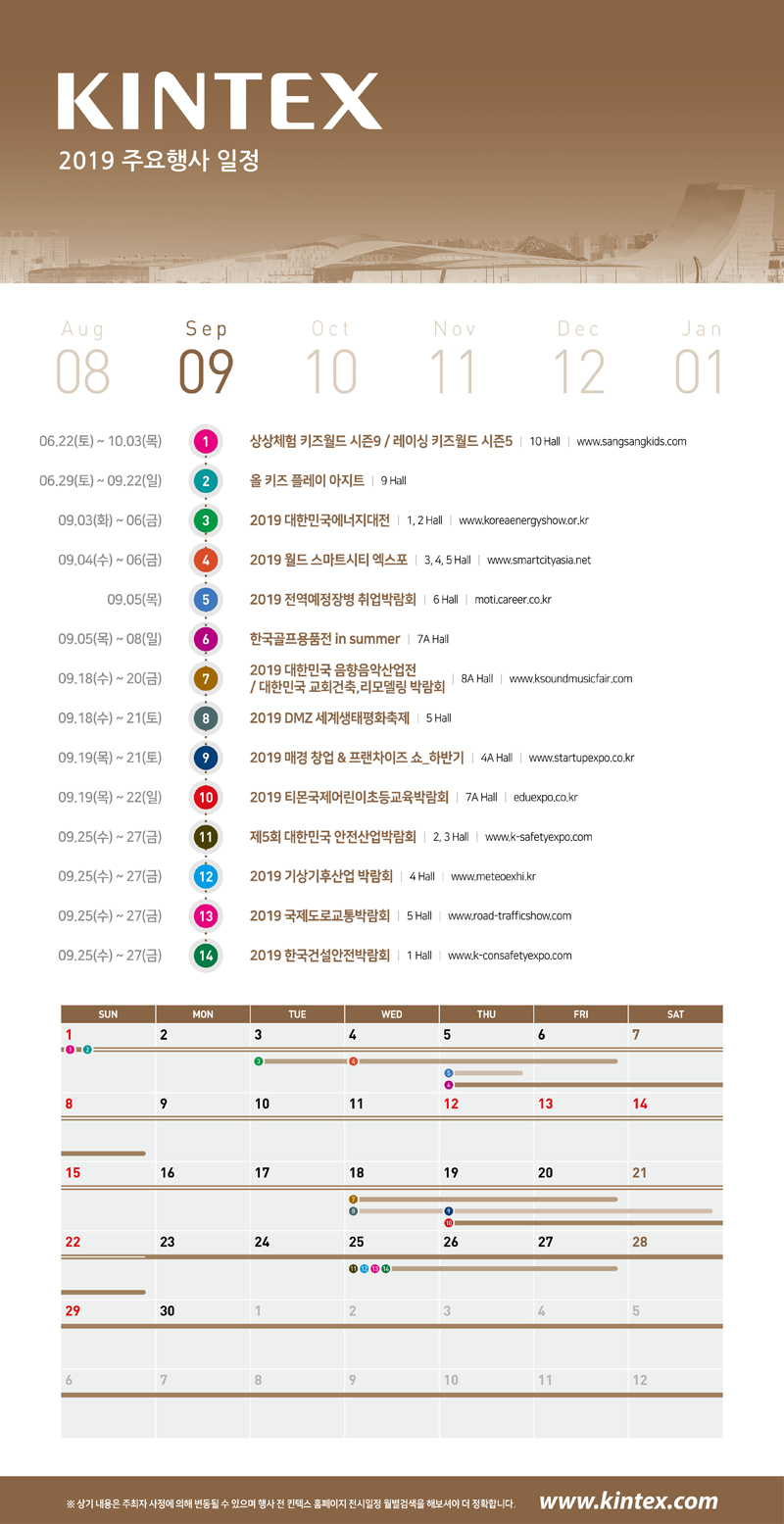 일산 킨텍스 제1전시장에서 9월 25일~27일까지 3일간 개최되는 대한민국 안전산업박람회, 기상기후산업박람회, 국제도로교통박람회, 한국건설안전박람회는 각각의 안전 관련 분야의 전문 전시회로 개최됨과 동시에 유관분야의 박람회 동시개최로 관련 바이어들의 참가 확대 및 분야별 안전산업 활성화 등에 대해 시너지 효과를 내면서 안전분야 최대 규모의 종합 박람회가 될 것으로 기대되고 있다.