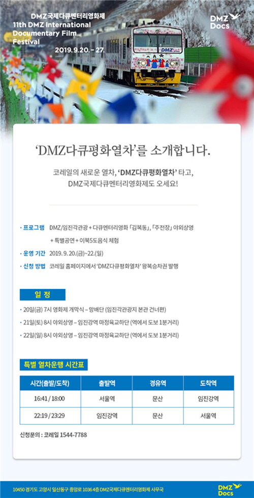 [고양신문] 제11회 DMZ국제다큐멘터리영화제(조직위원장 이재명, 집행위원장 홍형숙)가 오는 20일부터 27일까지 개최된다. 영화제에 참석하는 시민들의 편의를 위하여 서울역과 임진강역을 이어주는 DMZ평화열차(코레일)가 영화제 일정에 맞춰 추가 운행된다.