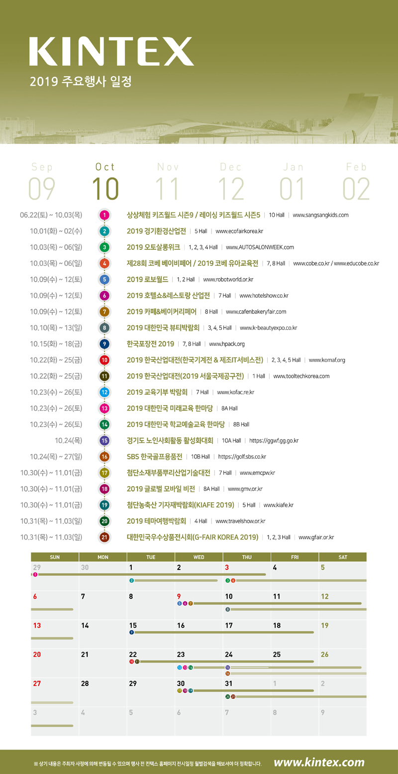 [고양신문] 제28회코베 베이비페어, 2019로보월드, 2019교육기부박람회, SBS한국골프용품전, 대한민국우수상품전시회 등 다양한 전시행사가 10월에 킨텍스에서 열릴 예정이다. 주요 전시행사 중 ‘2019오토살롱위크’와 ‘2019대한민국 뷰티박람회’에 대해 자세히 소개한다.