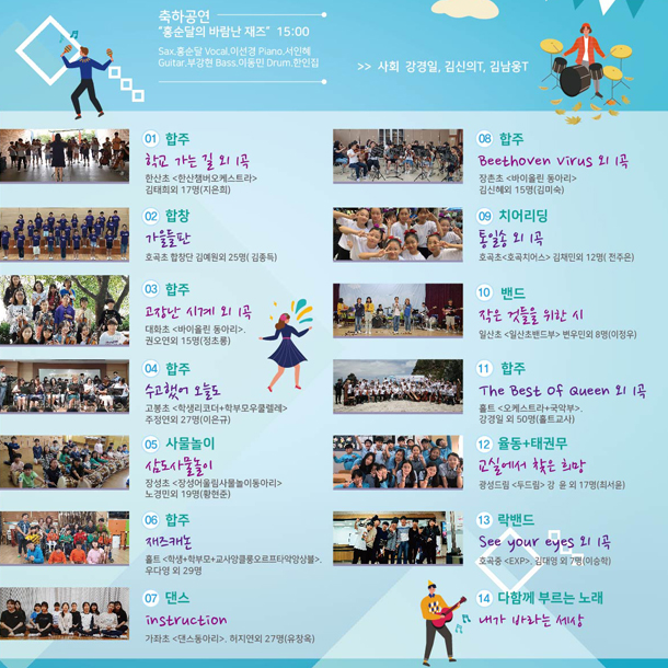 전체적인 공연을 보면 한산초 학생들의 ‘학교 가는 길’을 시작으로 호곡초·대화초·고봉초·장성초·홀트학교·가좌초·장촌초·일산초·광성드림학교·호곡중 학생들이 오케스트라와 합창단 콜라보·퓨전·댄스·밴드·치어리딩·락밴드·율동+태권무 등의 다양한 공연을 펼친다. 또한 학생과 학부모 교사의 합주 등은 예술한마당의 재미를 한껏 높일 것으로 보인다. 한편 홍순달 재즈리스트의 바람난 재즈가 예술한마당을 더욱 즐겁게 하기 위해 축하공연을 펼쳐 깊어가는 가을밤을 무르익게 한다.