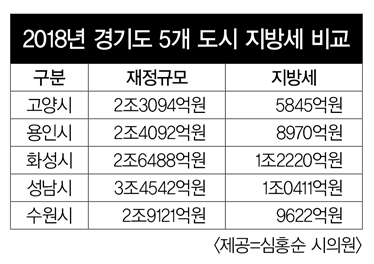 [고양신문] 고양시 재정 중 자체수입인 ‘지방세’ 비율이 타 도시에 비해 매우 낮은 것으로 확인됐다. 2018년 기준 고양시 지방세는 약 5800억원 규모로 고양시와 비슷한 재정규모를 가진 화성, 용인, 성남, 수원과 비교해 가장 낮은 수치를 보였다<표 참고>.