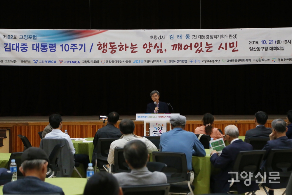[고양신문] 김대중 대통령 당선 시절 인수위에 참여했으며 김대중 정부 초기 청와대 경제수석을 지냈던 김태동 성균관대 명예교수가 고양시를 방문했다. 고양신문 주관으로 21일 일산동구청에서 열린 10월 고양포럼은 김대중 대통령의 삶과 업적을 되돌아보는 시간을 갖기 위해 김 전 대통령을 보좌했던 김태동 교수를 강사로 초청했다.